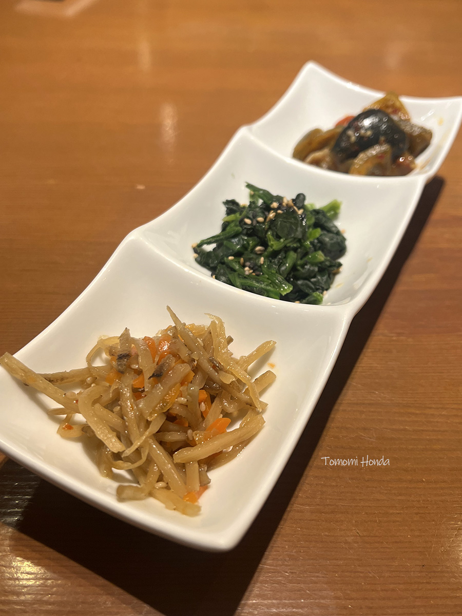 まずテーブルにのったのは、3種類のパンチャン(おかず)。きんぴら、ほうれん草のナムル、そしてナスのナムル。 シンプルなパンチャンだからこそ、メイン料理が引き立ちますね!