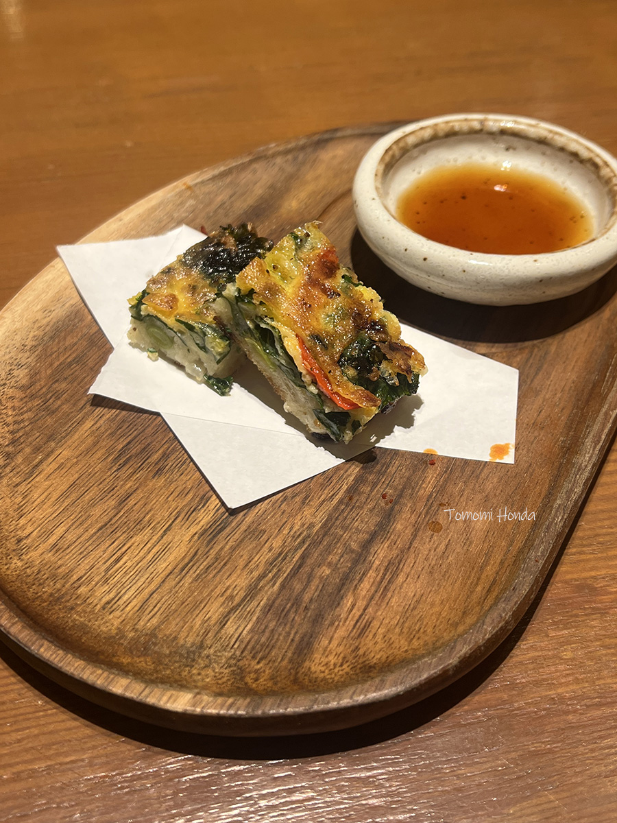 そして2品目は、スランジェではお馴染みのケールチヂミ。 女性は色々な料理を少しずつ食べたいですよね。そんな気持ちを満たしてくれる、ちょうど良いボリュームのチヂミです。