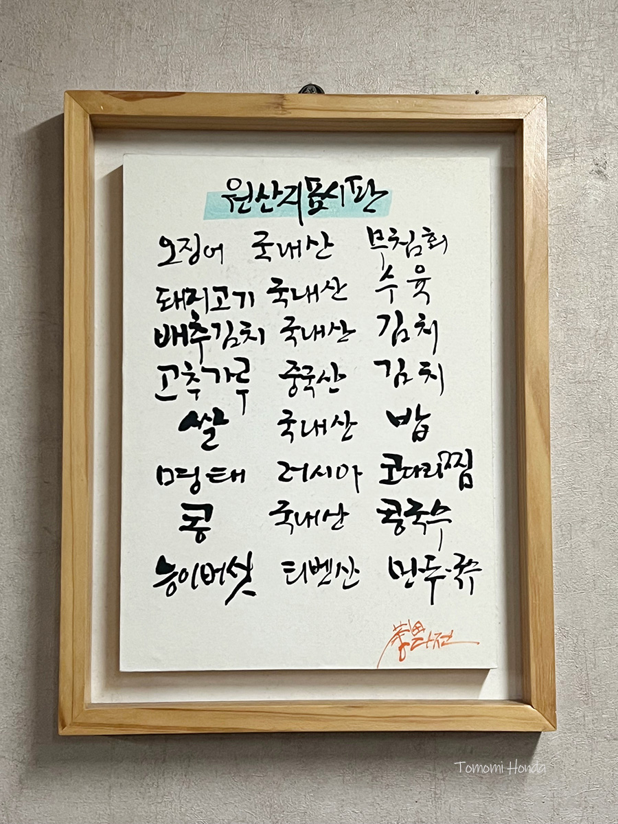 韓国の食堂って、写真のように食材の原産地を表示している所が多いじゃないですか。これを見ると、誠意が感じられて安心します。