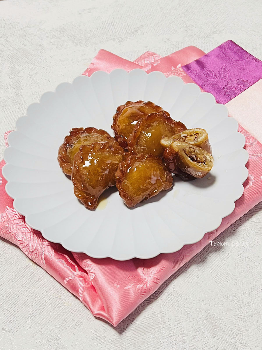 2025年の締めくくりにふさわしいテーマは、韓国の宮中菓子「饅頭果(マンドゥグァ)」。薬果(ヤックァ)とはまた違った魅力があり、小麦粉の生地に 「あん」を包み、餃子のような形にして油でカリッと揚げる外側はさっくり、中はしっとりの韓国伝統のお菓子です。