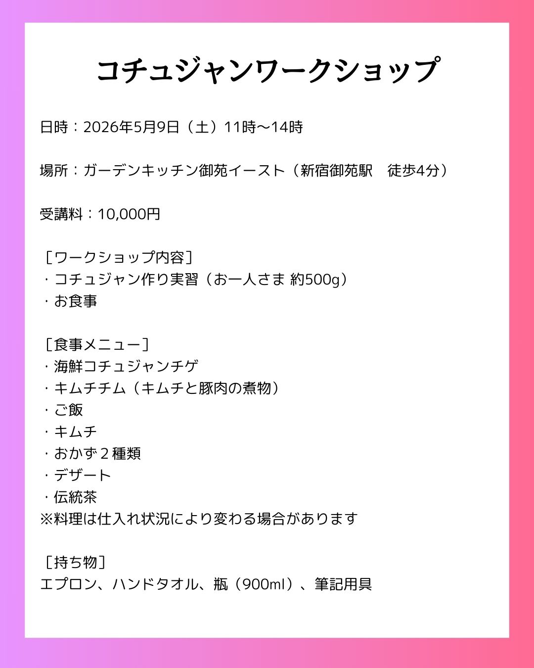 - 2026年5月9日(土)コチュジャンワークショップ ガーデンキッチン御苑イースト