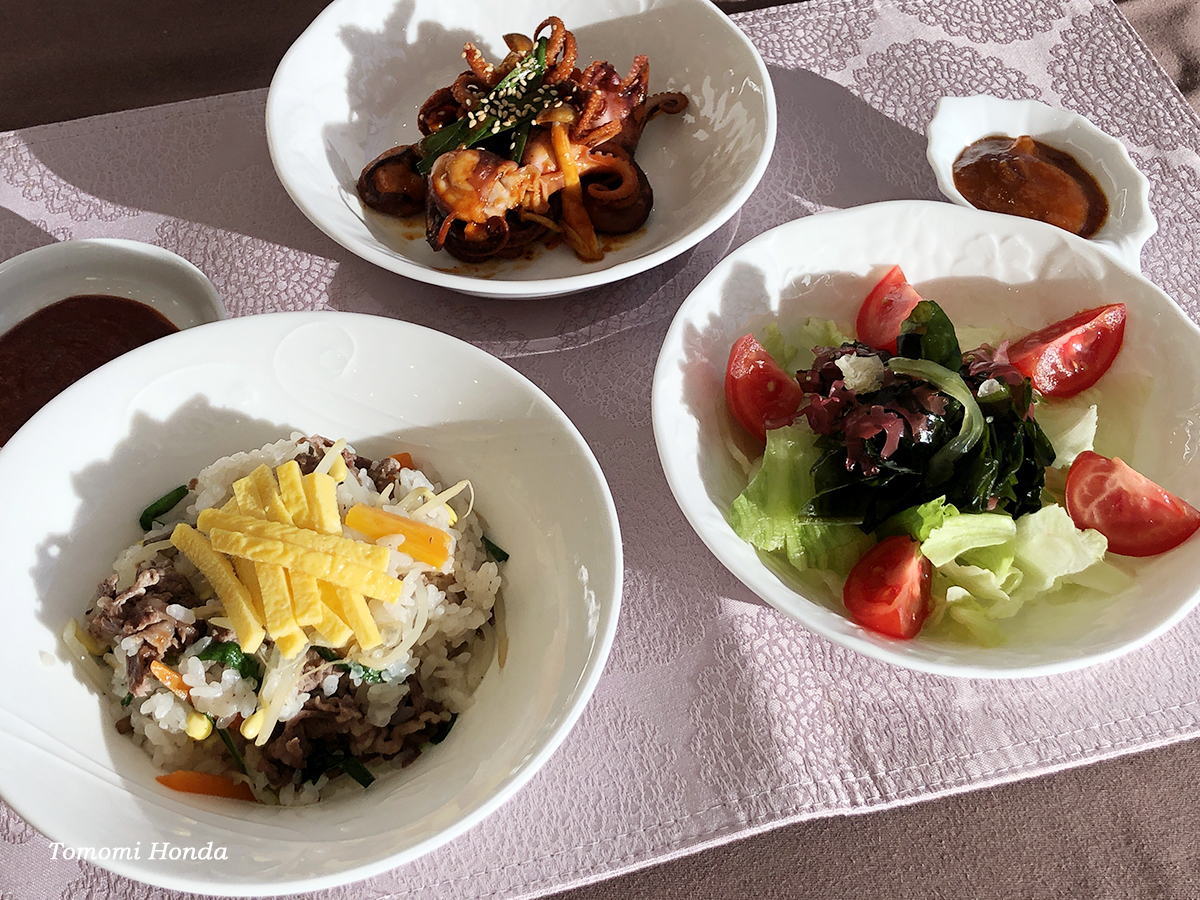 肝心の料理はこの二日間共通で、炊き込みビビンバ、サムジャンドレッシングのサラダ、そしてイイダコ(チュクミ)の炒め物でした。