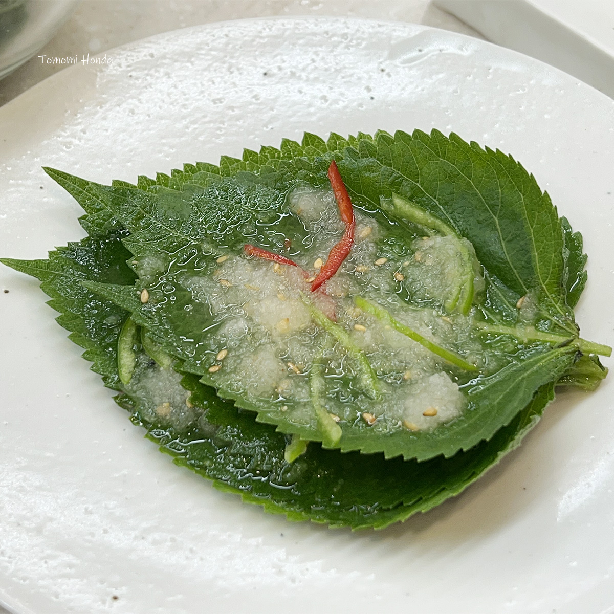 二品目はえごまの葉の梨和えです。とーっても簡単に作れる副菜でした。