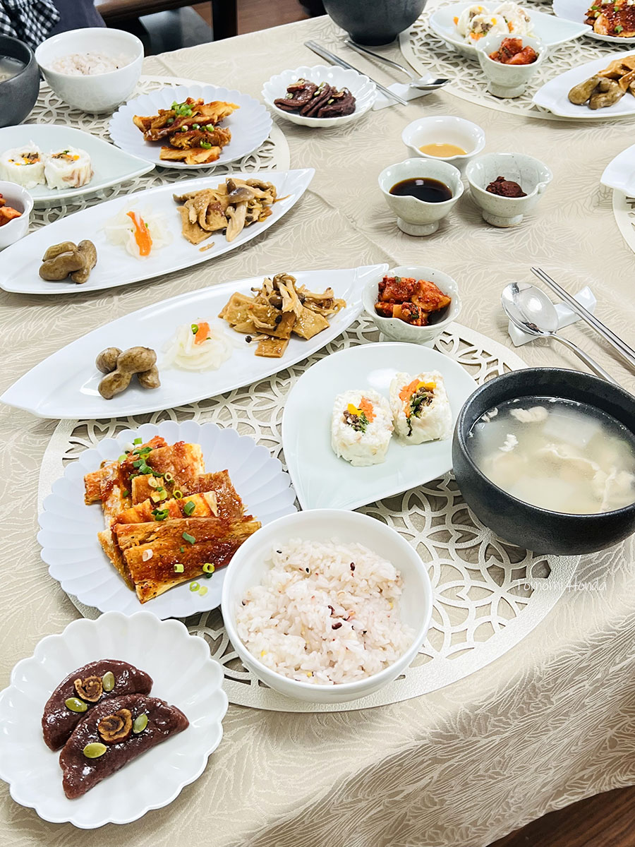 白身魚の蒸し物(어선/オソン)、干し鱈焼き(황태구이/ファンテクイ)、鶏スープ(닭곰탕/タッコムタン)、焼き餅(부꾸미/プクミ)の4品を実習しました。