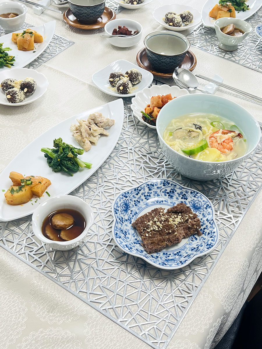 食事には、菊芋のしょうゆ漬け(チャンアチ)、大根キムチ(カクトゥギ)、蒸し鶏のエゴマ和え(タットゥルケムチム)、ジャガイモの甘辛煮(カムジャジョリム)もご用意。休憩時間にはチーズケーキに、きんかんの砂糖煮(クムギュルジョングァ)を添えました。