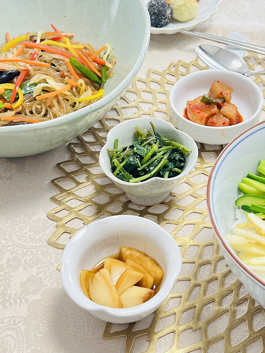 実習のあとは、私が用意したおかずとともに食事。2品の他は、野菜チャプチェ、きのこのえごまスープ、新たまねぎのしょうゆ漬け、大根キムチ、しらやまぎくのナムル、きんかんのシロップ煮でした。